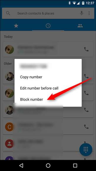 Самый простой способ сделать это - нажать и удерживать номер в журнале вызовов, а затем выбрать «Заблокировать номер».