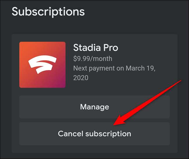 Теперь вы должны увидеть список подписок, включая ваше членство в Stadia Pro. Нажмите кнопку «Отменить подписку».
