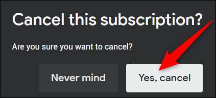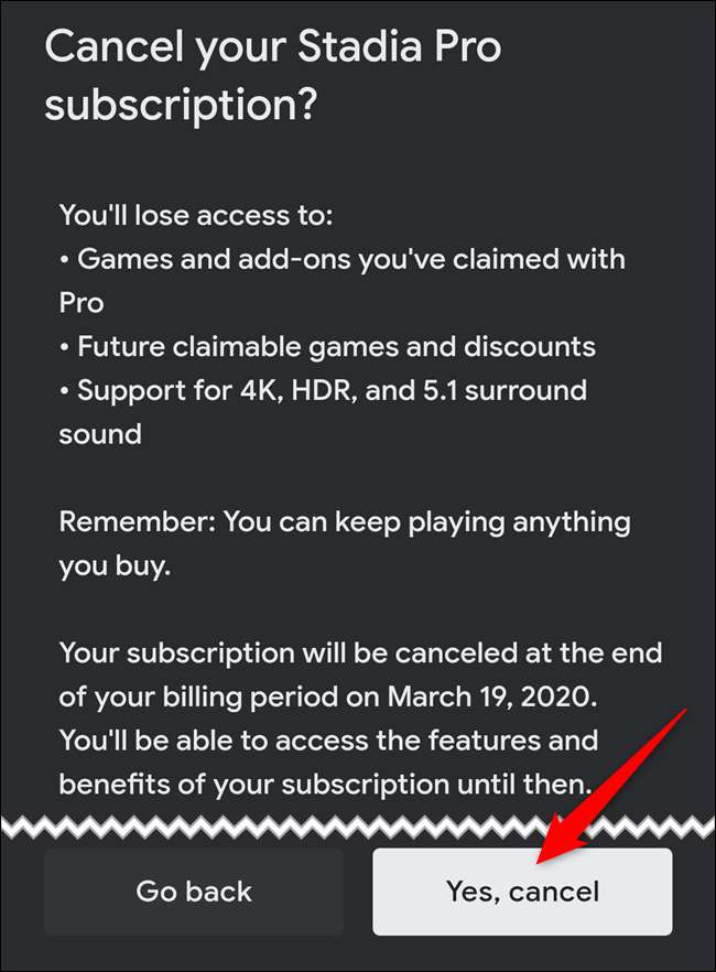 Подтвердите, что вы хотите отменить подписку на Stadia Pro со своего компьютера, нажав кнопку «Да, отменить».