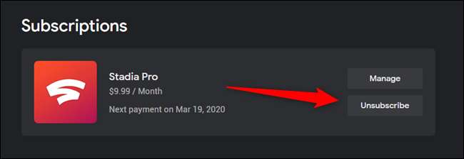 Теперь вы должны увидеть свое членство в Stadia Pro в списке под заголовком «Подписки». Нажмите кнопку «Отписаться», чтобы продолжить.
