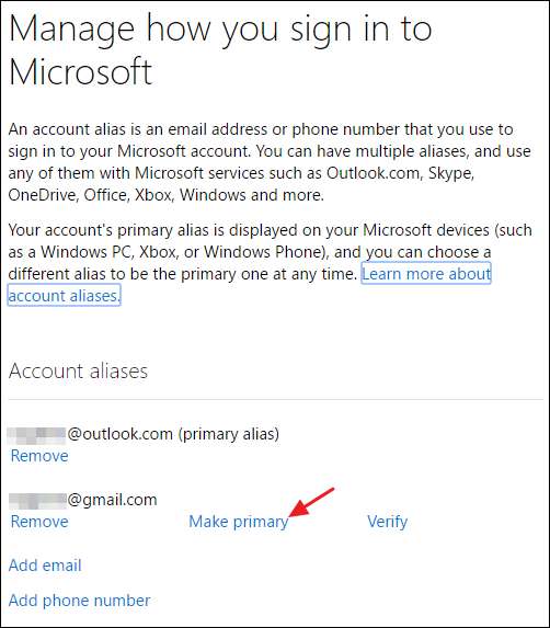 Но вы также можете сделать свой новый псевдоним своей основной учетной записью, если хотите. Преимущество этого заключается в том, что электронные письма от Microsoft, касающиеся вашей учетной записи, платежей, которые вы производите за услуги, и т. Д. Будут поступать в эту учетную запись. Это также отличный способ просто объединить все под предпочитаемым адресом электронной почты. Кроме того, если вы хотите удалить адрес, который уже является вашим основным псевдонимом, вам нужно сделать другой адрес своим основным, прежде чем делать это.