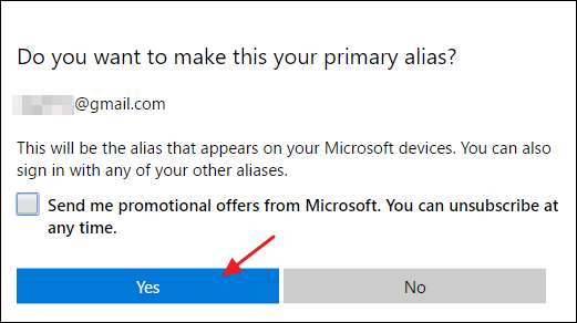 На странице подтверждения нажмите кнопку «Да», чтобы сделать адрес электронной почты своим основным псевдонимом. Если вы не хотите получать рекламные предложения от Microsoft по этому адресу, обязательно отключите этот параметр.