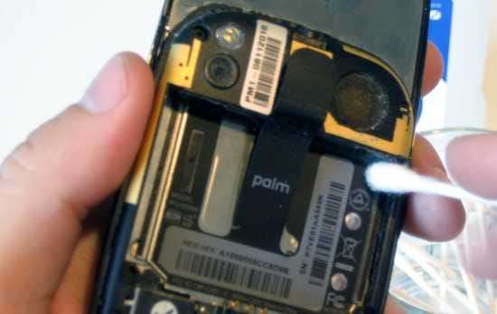 Очистив внешнюю поверхность, используйте сухой ватный тампон, чтобы удалить пыль под крышкой батарейного отсека. Если под крышкой аккумуляторного отсека есть устойчивые участки, очистите их очень небольшим количеством дистиллированной воды. Немедленно высушите все очищаемые детали водой, чтобы ничто не попало внутрь телефона.