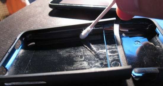 Если вы используете пластиковый чехол / чехол для телефона, используйте разбавленный медицинский спирт и ватные палочки для очистки изнутри и снаружи.