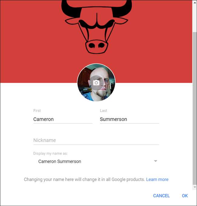 Как указано в нижней части страницы, стоит помнить, что если вы измените свое имя здесь, оно изменится во всех продуктах Google. Поэтому, если вы используете свой адрес Gmail для профессионального общения, вероятно, не лучшая идея менять свое имя на Namey McNameface.