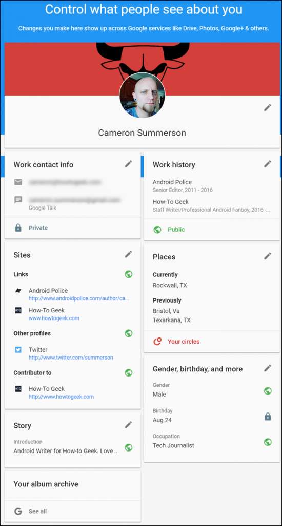 К счастью, эту информацию невероятно легко изменить. Google хранит ваш личный профиль в удобном Страница "Обо мне" . Направившись туда, вы можете начать видеть то, что видят другие люди, и не позволять им видеть это, если хотите.