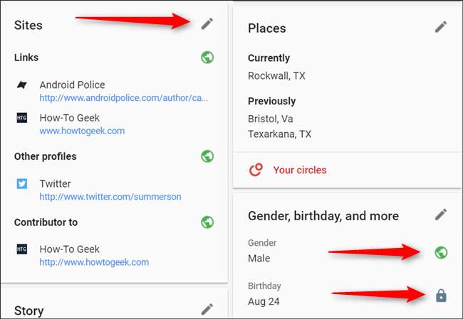 И вот как это работает повсеместно: щелкните значок карандаша, чтобы отредактировать отображаемую информацию (или добавить к ней), затем щелкните индикатор уровня конфиденциальности, чтобы изменить текущие права просмотра.