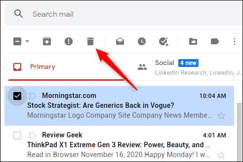 Нажмите значок «Мусорное ведро», чтобы отправить электронные письма в папку для мусора