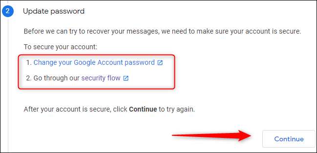 Затем вы попросите попросить подтвердить информацию о вашей учетной записи снова. Это то же самое, что вы сделали в шаге. Нажмите «Продолжить». Как только вы нажмете «Продолжить», Google увидит, сможет ли они восстановить ваши электронные письма.