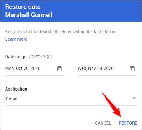 Появится окно «Данные восстановления». Выберите диапазон дат, который вы хотели бы попытаться восстановить электронные письма, выбрать «Gmail» в раскрывающемся выпадении «Приложения», затем нажмите «Восстановить».