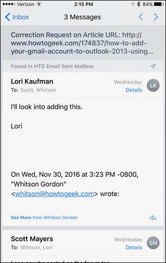 Когда вы нажимаете на любое электронное письмо в беседе, оно открывается, но вы также можете прокручивать вверх и вниз, чтобы получить доступ к другим электронным письмам в беседе.