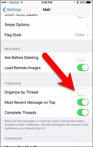 Многопоточное представление включено по умолчанию в iOS 10, но его легко отключить, если вы не хотите использовать эту функцию. Вы должны включать и выключать эту функцию в главном приложении «Настройки» на телефоне, а не в приложении «Почта», поэтому нажмите «Настройки» на главном экране.