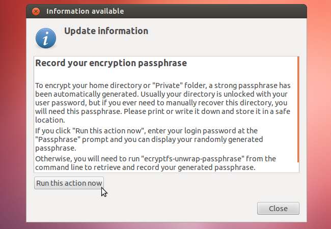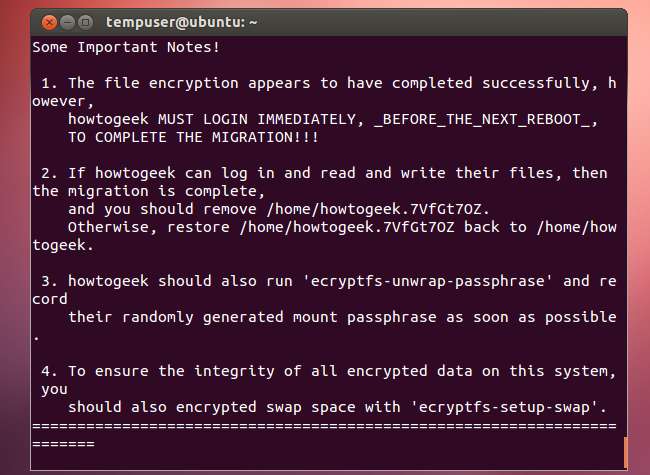Вам нужно будет указать пароль своей учетной записи. После этого ваш домашний каталог будет зашифрован, и вам будут представлены важные примечания. Таким образом, в примечаниях говорится:
