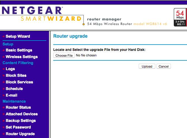 Старые маршрутизаторы могут просто предлагать страницу, на которой вы можете загрузить файл прошивки, как на этом более старом маршрутизаторе Netgear ниже. Вам нужно будет проверить версию прошивки, установленной на вашем маршрутизаторе - возможно, на отдельной странице «Состояние» - а затем посетить официальный веб-сайт производителя маршрутизатора, найти страницу «Поддержка» или «Загрузки» для вашей конкретной модели маршрутизатора. , а также проверьте и загрузите последние обновления прошивки вручную.