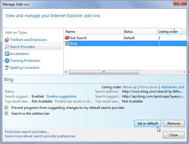 - Internet Explorer : Нажмите кнопку с шестеренкой, выберите «Управление надстройками» и выберите категорию «Поставщики поиска». Выберите предпочитаемую поисковую систему из подсвеченного и нажмите кнопку Установить по умолчанию в нижней части окна. Вы также можете установить флажок «Запретить программам предлагать изменения в моей поисковой системе по умолчанию».