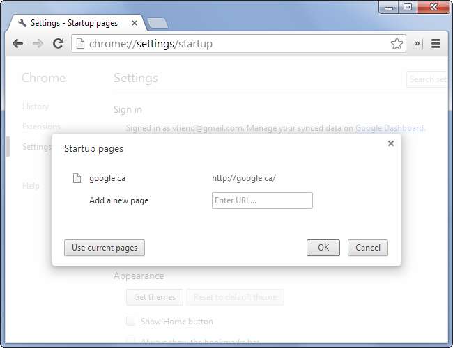 - Гугл Хром : Нажмите кнопку меню Chrome, выберите "Настройки" и установите флажок "Показывать кнопку" Домой "под внешним видом. Щелкните параметр «Изменить» и измените домашнюю страницу. Вы также должны выбрать параметр «Установить страницы» в разделе «При запуске» и убедиться, что дополнительные веб-страницы не загружаются при запуске.