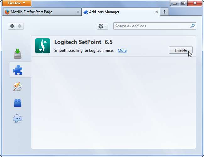 - Mozilla Firefox : Нажмите кнопку меню Firefox и выберите Расширения. Выберите надстройку, которую хотите отключить, и нажмите кнопку Отключить.