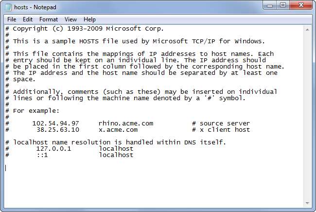 Проконсультируйтесь наше руководство по редактированию вашего файла hosts Чтобы получить больше информации. Ищите необычные записи. По умолчанию в файле хостов Windows не должно быть записей под прокомментированные строки (это строки, которые начинаются с символа #.) Вы, вероятно, можете удалить все, кроме строк с символом # перед ними, если увидите, что ваш файл hosts содержит мусор. На изображении ниже показан обычный файл hosts в Windows 7.
