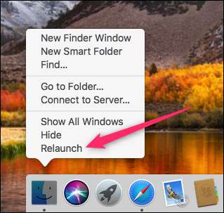Если вы не хотите использовать терминал, вы также можете, удерживая клавишу Option, щелкнуть правой кнопкой мыши значок Finder, а затем нажать команду «Перезапустить».