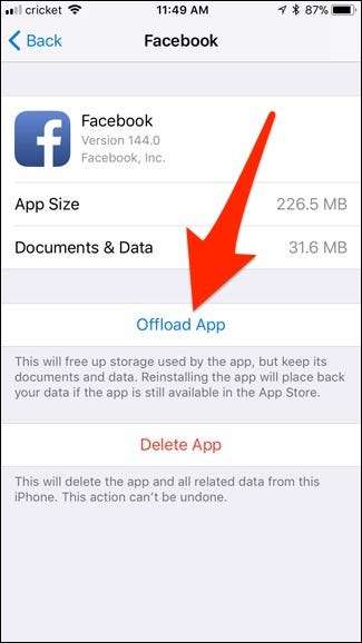 Это приведет к удалению приложения с вашего телефона, но сохранит все документы и данные, связанные с приложением, установленным на вашем устройстве. Так, например, приложение Facebook является здесь хорошим примером - оно занимает 258 МБ от общего пространства, но 226 МБ из этого объема будут удалены, когда вы его разгрузите. Остальные 32 МБ данных останутся на случай, если вы когда-нибудь захотите переустановить приложение в будущем. И если это приложение синхронизируется с iCloud, эти данные также вернутся.