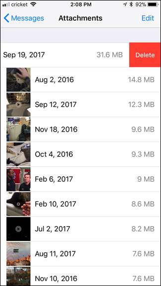 Это отобразит список всех фотографий, видео и других вложений, сохраненных приложением «Сообщения» из всех ваших цепочек бесед, и он будет отсортирован в первую очередь по наибольшему размеру. Все, что вам нужно сделать, это провести пальцем влево и нажать «Удалить» на том, что вам больше не нужно.