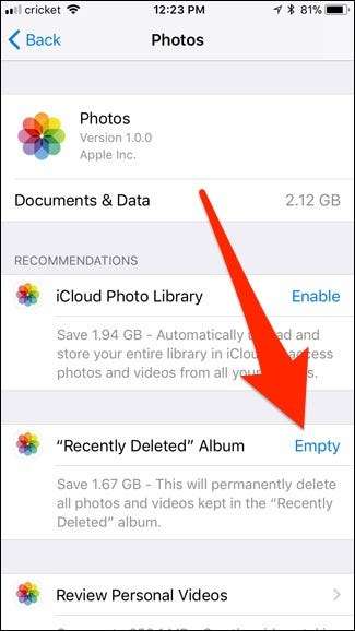 Оттуда нажмите «Очистить» рядом с «Недавно удаленный альбом». Ниже он сообщит вам, сколько места это освободит.