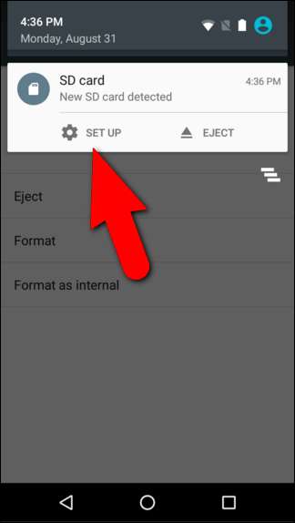 Вставьте SD-карту в ваше устройство. Вы должны увидеть уведомление об обнаружении новой SD-карты. Нажмите «Настроить». (Если вы не видите это уведомление, откройте приложение «Настройки» Android, перейдите в «Хранилище и USB» и нажмите кнопку меню, чтобы выбрать «Отформатировать как внутреннее».
