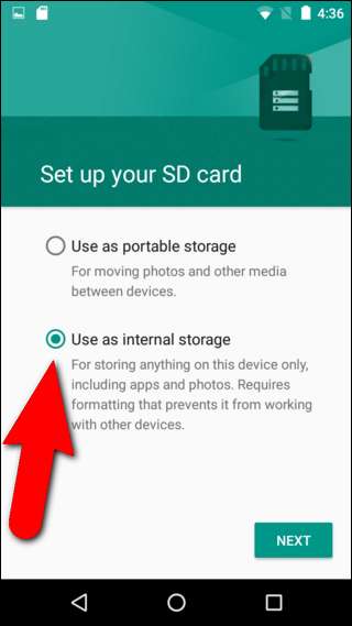 Появится экран, на котором вы сможете выбрать, хотите ли вы использовать SD-карту в качестве портативного или внутреннего хранилища. Нажмите «Использовать как внутреннее хранилище», а затем нажмите «Далее».