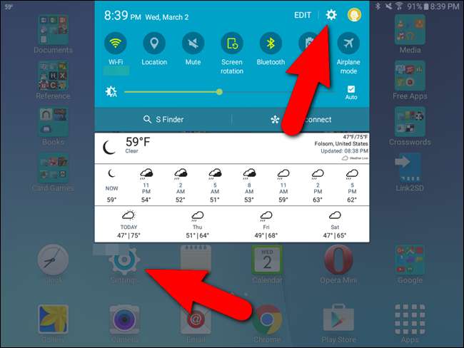 Чтобы переместить приложение на SD-карту, откройте настройки своего устройства. На стандартном устройстве Android, таком как Nexus 7, смахните один раз вниз, чтобы открыть панель уведомлений, и еще раз, чтобы получить доступ к панели быстрых настроек. Затем коснитесь значка «Настройки» в правом верхнем углу панели быстрых настроек. На любом устройстве Android вы также можете открыть панель приложений и нажать там значок «Настройки».