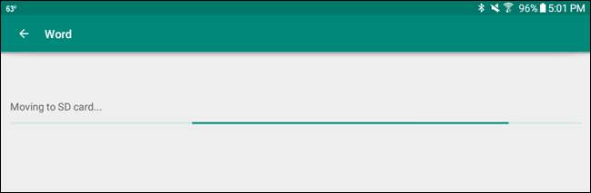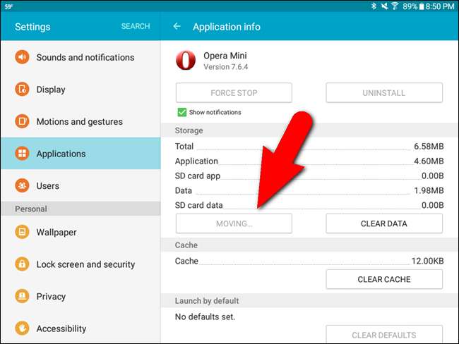 Во время перемещения приложения кнопка «Переместить на SD-карту» становится серой и отображает сообщение «Перемещение…».