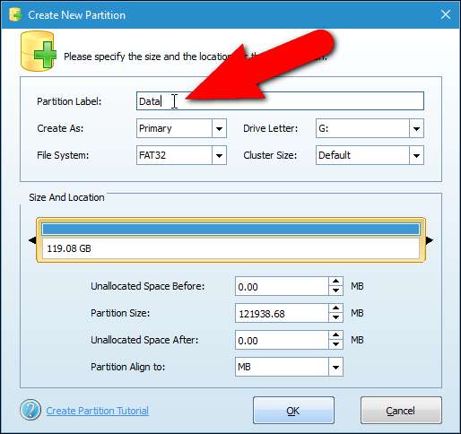 При желании введите имя для «Метки раздела» и нажмите «ОК». Размер раздела менять не нужно. Оставшееся место на SD-карте автоматически используется для второго раздела.