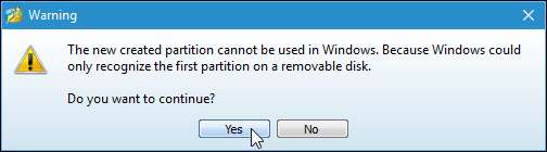 Вы получите диалоговое окно с предупреждением о том, что новый раздел не будет работать в Windows (помните, когда мы говорили вам, что создание разделов на SD-карте для установки приложений непосредственно на карту отличается от разделения диска для использования на ПК с Windows ?). Windows может распознать только первый раздел съемного диска. Однако, поскольку мы не используем эту SD-карту на ПК с Windows, мы можем продолжить создание второго раздела. Щелкните «Да».