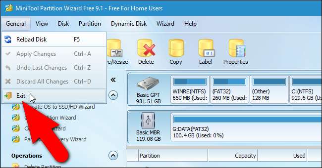Выберите «Выход» в меню «Общие», чтобы закрыть MiniTool.