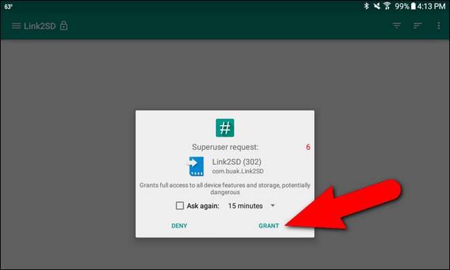Если вы рутировали свое устройство с помощью нашего руководство , то на вашем устройстве установлен SuperSU, и вы увидите следующее диалоговое окно с просьбой предоставить полный доступ к Link2SD. Нажмите «Грант».
