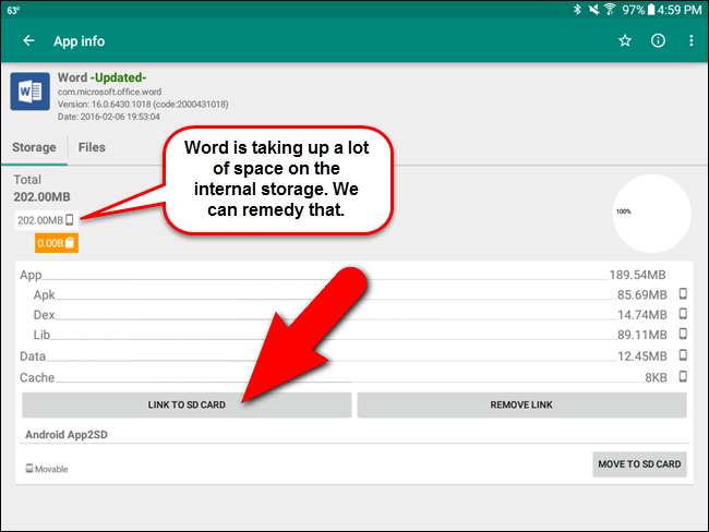 Однако мы можем выйти за рамки этого ограничения. Мы открываем Link2SD и прокручиваем список приложений, пока не дойдем до Word и не нажмем на него.