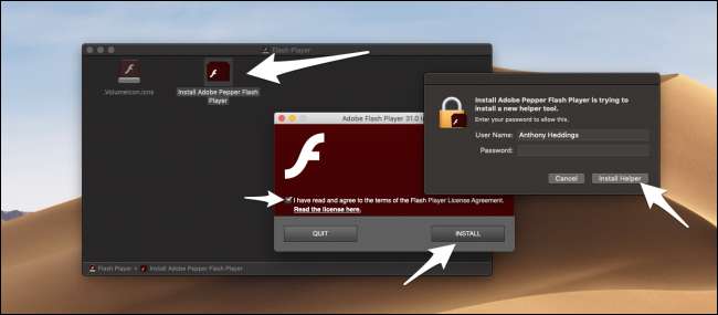 Flash поставляется в DMG, и у них есть отдельные версии для разных браузеров. Выберите используемый браузер, загрузите Flash и откройте его. Должен быть запущен один установщик, и все, что вам нужно сделать, это согласиться с Условиями и положениями и ввести свой пароль Mac, чтобы разрешить установку.