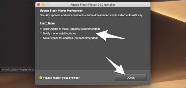 Установщик Flash спросит вас, как вы хотите, чтобы программа обновлялась - автоматически, вручную или во всплывающем окне, как в большинстве приложений App Store. Поскольку известно, что у Flash была грубая история с довольно много уязвимостей , вероятно, лучше обновлять автоматически.