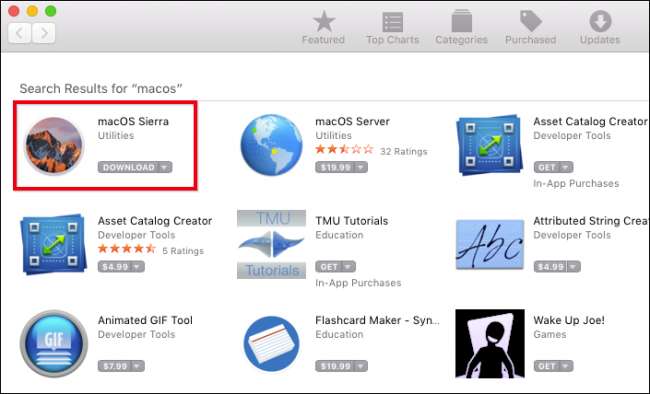 Во-вторых, вам понадобится копия установщика macOS Sierra. Вы можете загрузить установщик Sierra в App Store, выполнив поиск по запросу «macOS». Убедитесь, что вы нажали «Загрузить» и дайте ему сохраниться на жестком диске вашего Mac.