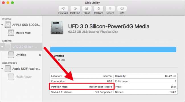 После запуска Дисковой утилиты щелкните на внешнем устройстве на левой панели и проверьте карту разделов. В нашем случае наш диск разбит на разделы с использованием основной загрузочной записи, а не GUID. Значит, нам обязательно нужно его отформатировать.