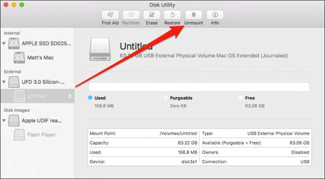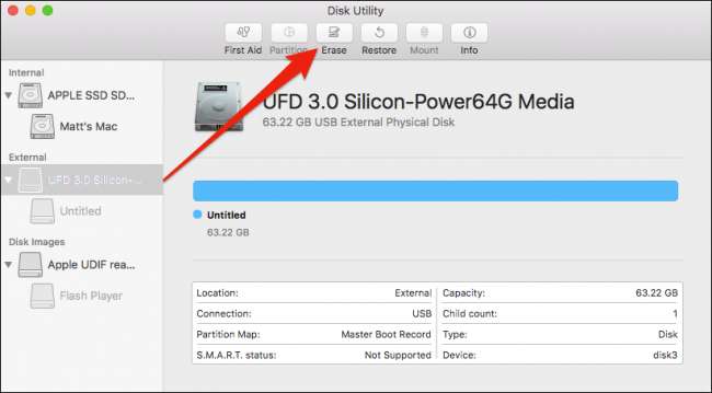 После того, как диск отключен, выберите полный диск на левой боковой панели (обозначенный здесь «UFD 3.0 Silicon»), а не под-диск (и) под ним (помеченный здесь «Без названия») - и нажмите «Стереть» вверху. ряд кнопок.