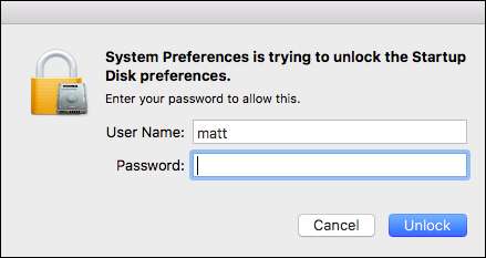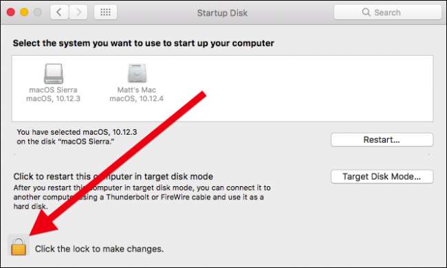 Чтобы выбрать другой загрузочный диск, вам нужно будет щелкнуть замок в нижнем левом углу.