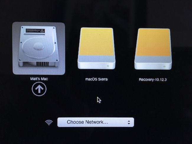 Чтобы загрузиться с внешнего диска Sierra, подключите его к соответствующему Mac, нажмите кнопку питания и удерживайте клавишу «Option», пока не появится экран диска восстановления. Оттуда вы можете выбрать свой внешний диск и щелкнуть стрелку, чтобы загрузить его для этого сеанса.