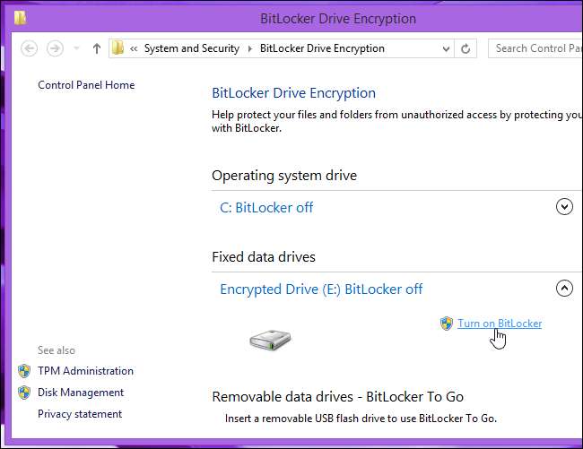 Для этого щелкните правой кнопкой мыши зашифрованный диск и выберите «Управление BitLocker» или перейдите на панель BitLocker на панели управления. Щелкните ссылку Отключить BitLocker под зашифрованным томом.