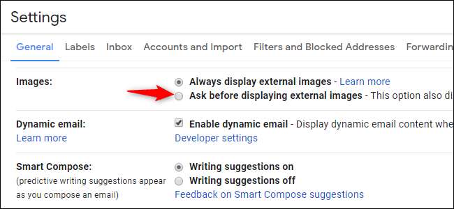 В Gmail перейдите в Настройки> Общие. Справа от раздела «Изображения» выберите «Спрашивать перед отображением внешних изображений». Прокрутите страницу вниз и сохраните изменения.