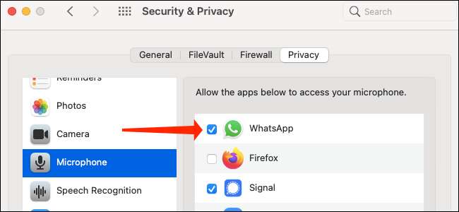 Затем вы можете нажать «Микрофон» в безопасности и AMP; Настройки конфиденциальности на MacOS и убедитесь, что флажка рядом с «WhatsApp» проверяется.