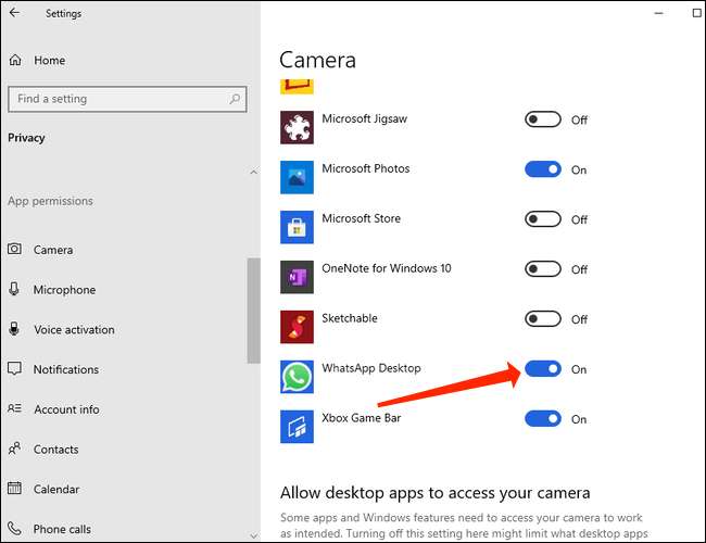 Чтобы дать WhatsApp для Windows 10 доступа к вашей камере, перейдите к настройкам и GT; Конфиденциальность и GT; Камера. Нажмите на переключатель рядом с «WhatsApp», чтобы убедиться, что это «включено».