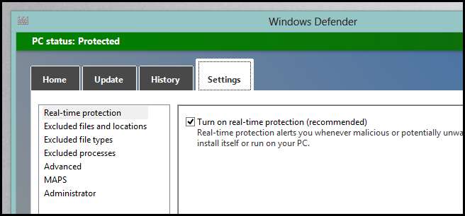 После того, как вы откроете Защитник Windows, перейдите на вкладку настроек.