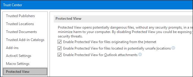 Вы можете управлять настройками защищенного просмотра в меню «Файл»> «Параметры»> «Центр управления безопасностью»> «Настройки центра управления безопасностью»> «Защищенный просмотр». Убедитесь, что здесь включены параметры «Защищенный просмотр».