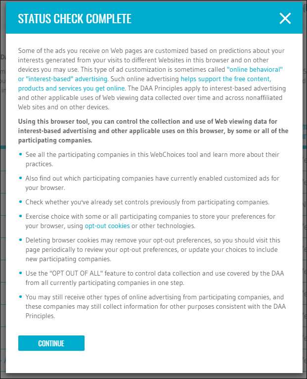 Чтобы проверить это, перейдите на портал YourAdChoices WebChoices и пусть делает свое дело. Сканирование будет выполняться относительно быстро, и по его завершении появится всплывающее окно с некоторыми деталями.