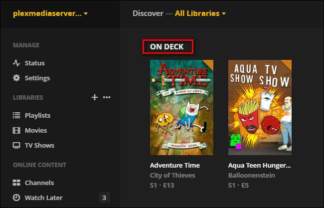 Прекрасным примером того, где может быть полезен этот трюк, является категория телешоу «На палубе», в которой показаны предстоящие телешоу, основанные на сериале, который вы смотрели. На скриншоте ниже видно, что мы наблюдали Время приключений а также Aqua Teen Hunger Force . Вместо того, чтобы оптимизировать каждый эпизод всего шоу, мы говорим Plex оптимизировать только те эпизоды, которые мы еще не смотрели. Мы нажмем «На палубе», чтобы подробнее ознакомиться с категорией.